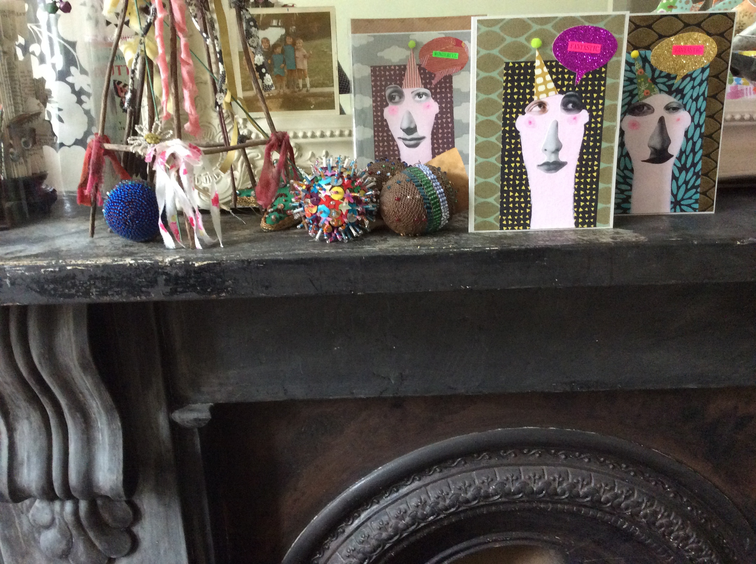 Hand painted & decoupaged characters on found printed pattern papers with additions. An A6 folded coloured card with a C6 brown kraft envelope in a cellophane wrapper. The cards are blank inside. Each one is unique. Please enquire as to cost & availability.